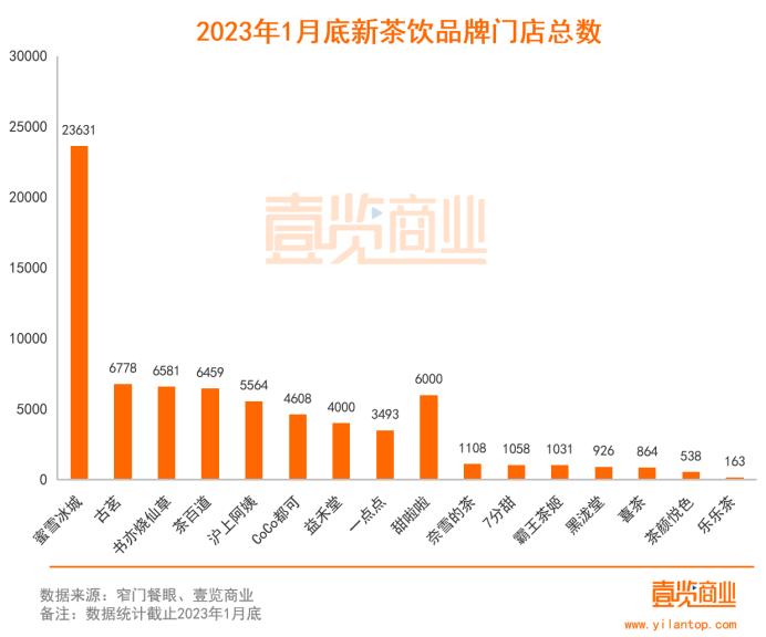 据《壹览商业》不完全统计,截至1月底,新茶饮现存门店约73000家。其中,万店级别的品牌仅蜜雪冰城一家,以23631家店实现断层领先;此外有4家门店数量为6000+;剩余大多在1000-5000家。