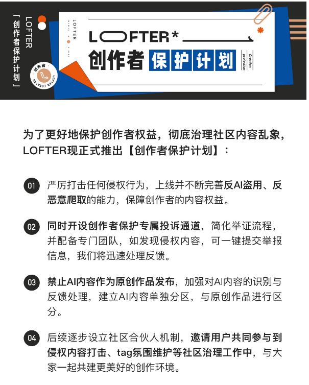 4、3月10日,LOFTER官方发布致歉信,并推出“创作者保护计划”:其中包括“上线并不断完善反AI盗用、反恶意爬取的能力”“禁止AI内容作为原创作品发布……建立AI内容单独分区”等机制。