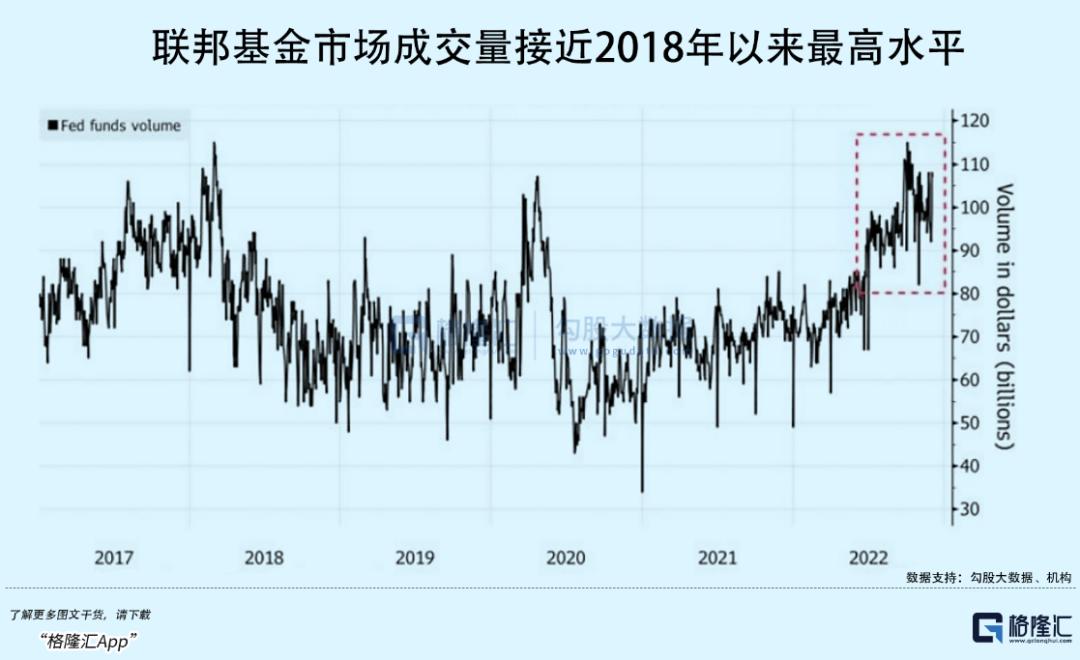 从去年开始,银行开始重返联邦基金市场获取现金。当年12月,巴克莱银行有一组数据显示,美国国内银行在联邦基金借款人中所占的比例已从5%升至12%。且联邦基金市场交易量接近2018年以来最高水平,且短期融资利率逐步攀升。