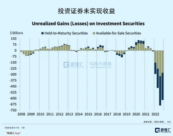 去年,美联储、欧洲央行、瑞士等全球重要央行账面都出现巨额亏损,因为它们持有大量国债,而去年国债价格暴跌。不过,不卖持有到期,亏损只是账面的,而不是真实的。除了央行们,美国银行业过去这么多年吞吐了大量国债。去年这些账面亏损并没有计入当期损益表中,而是放在了“可供出售和持有至到期证券”栏目下。