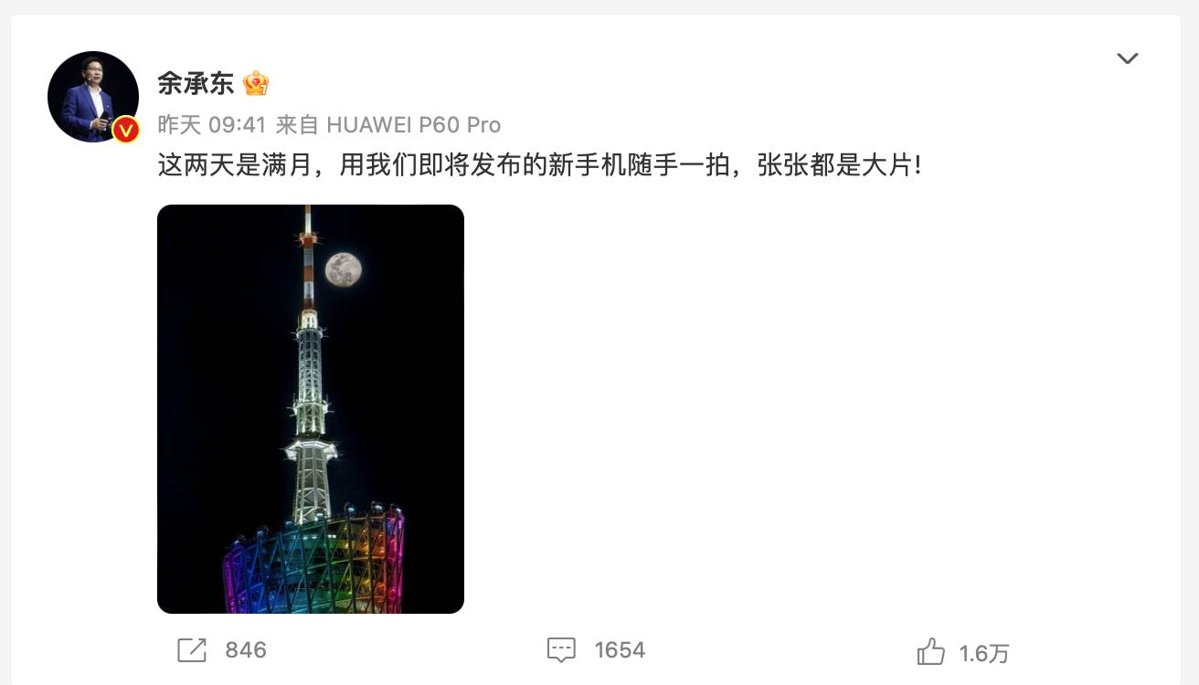 3月9日,余承东发布了一张用“新手机”拍摄月亮的照片并配文:“这两天是满月,用我们即将发布的新手机随手一拍,张张都是大片!”这条微博也确认了华为新机就是我们猜想中的P60系列,并且在短期内(暂定3月23日)就能与大家见面。