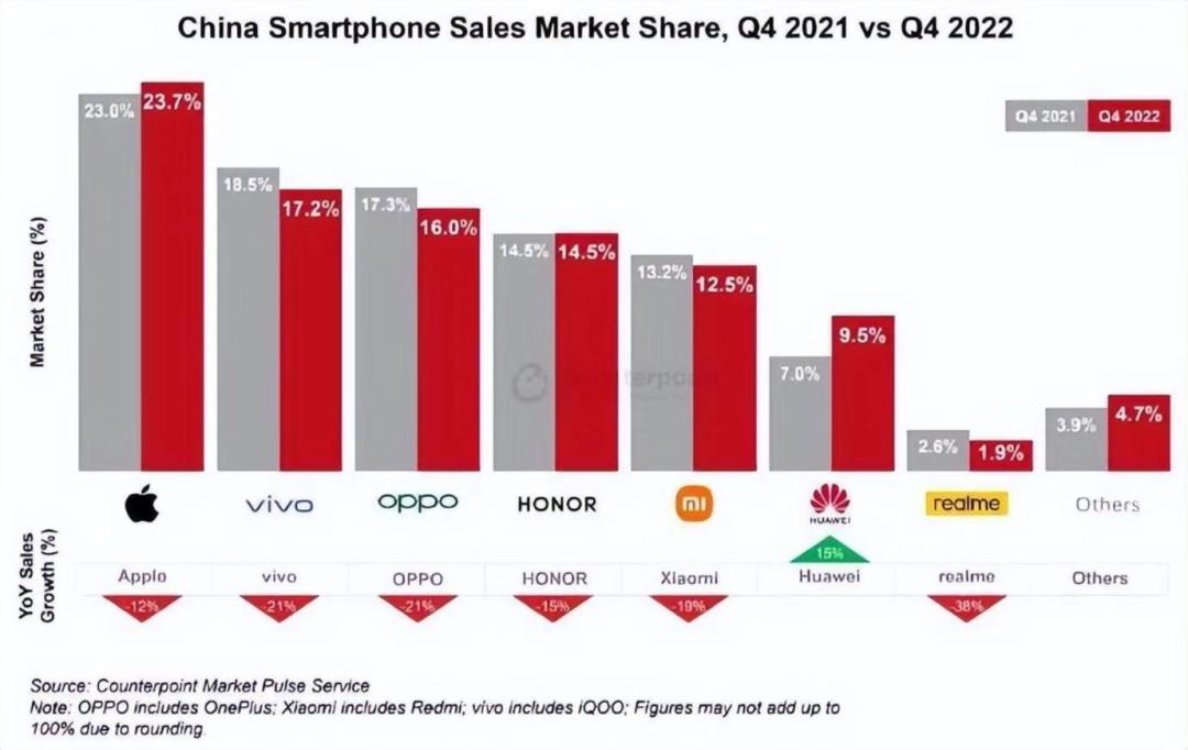 仅凭Mate50系列,华为在在去年四季度实现了销量的逆势增长。据Counterpoint数据,在2022年第四季度中国地区手机销量前五名的企业分别是苹果、vivo、OPPO、荣耀和小米,前五大手机厂商均出现了销量的同比下滑,且下滑幅度均在10%以上。而华为却实现了15%的销量涨幅,市场份额从2021年同期的7%增长到了9.5%,同比增加2.5个百分点。