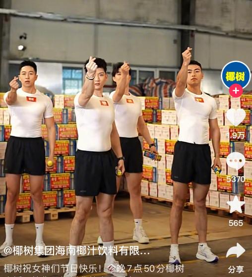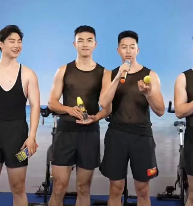 从3月1日的预直播到38节的正式直播,椰树男模们虽然一直握着自家的矿泉水、椰汁、椰子油等产品,但这更像是一场走火入魔健身教练们的比拼。他们时而穿着白色紧身T恤,时而套上性感黑丝背心,在直播间一边喊着“椰树,从小喝到大”,一边脱掉上衣、骑动感单车,还时不时地来一段唱跳,似乎想成为下一个韩国“双开门冰箱”。