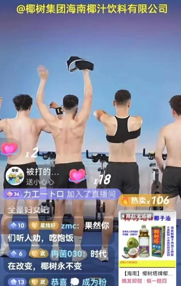 国产欲系鼻祖品牌椰树椰汁在被诟病物化女性多年后,终于有了新改变:直播间“卖男色”。