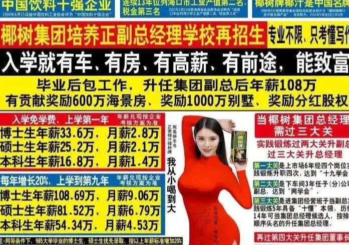 2020年,椰树要求应聘者“顾事业不顾家”,终身服务;去年3月,承诺“入学就有车、有房、有高薪、有美女帅哥追”,最后因妨碍社会公共秩序或者违背社会良好风尚被罚40万元