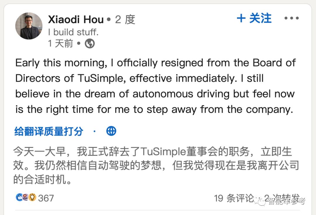 通过一则个人领英页面的最新动态,他表示已经辞任了图森董事会职务,即便依然心怀自动驾驶梦想,但此时已经到了合适的时候。