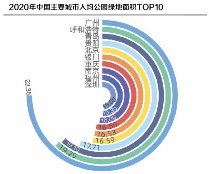 根据住建部《2020年城市建设统计年鉴》的数据,以4个直辖市、5个计划单列市和24个省会城市为样本,截至2020年底,中国主要城市中人均公园绿地面积指标排名前十的城市依次是广州、呼和浩特、青岛、贵阳、北京、银川、重庆、南京、福州、深圳。