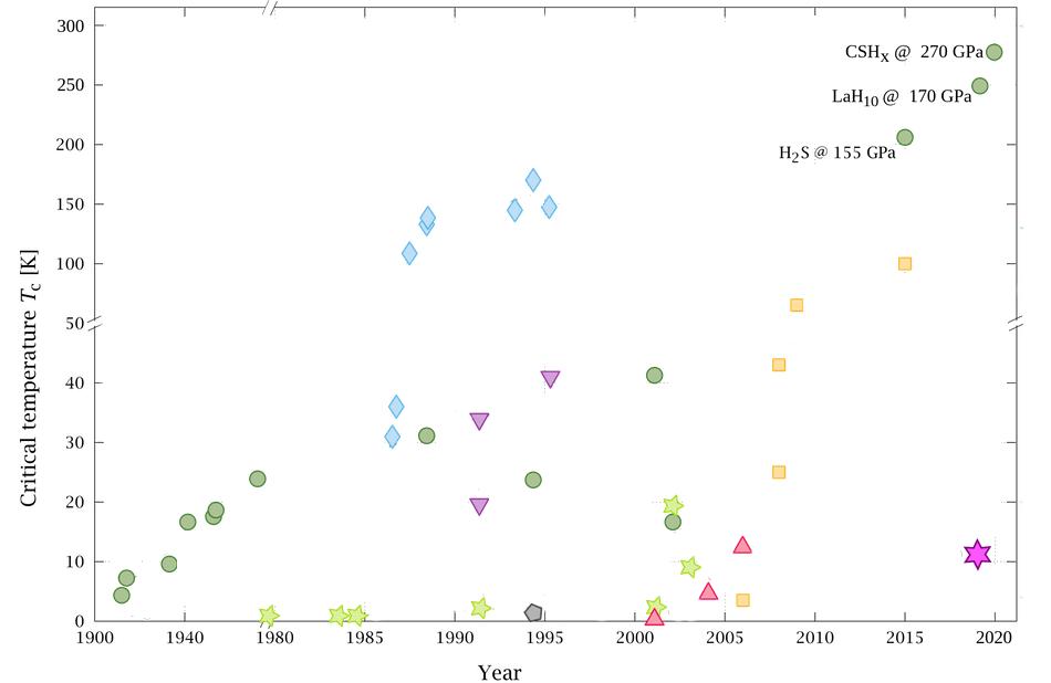 2020年10月14日,Dias和他的同事在《自然》杂志上宣布,他们在含氢材料碳氢化合物(CSH)中发现了超导性,其含量为287 K和267 GPa——第一个室温超导体。