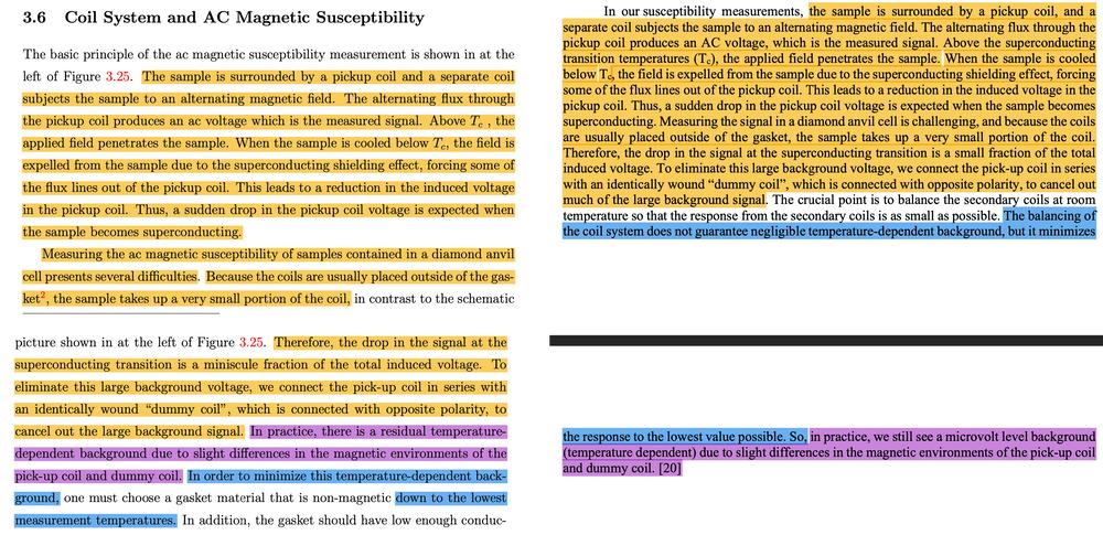 Hamlin关于磁易感性测量的论文第64页和第66页的段落(左)包含与Dias和Salamat的2021年arXiv论文第6页相同的文本,其中两人分享了原始CSH数据(右)。