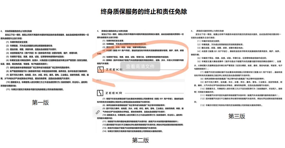 变更核心多是企业免责附加条款方面,如条款6、车辆发生重大事故或事件,在第二版中改为事故,并增加了超载项;第三版又改了回来,并明确标注“指并非是由于极氪汽车质量问题而导致的事故或事件”。