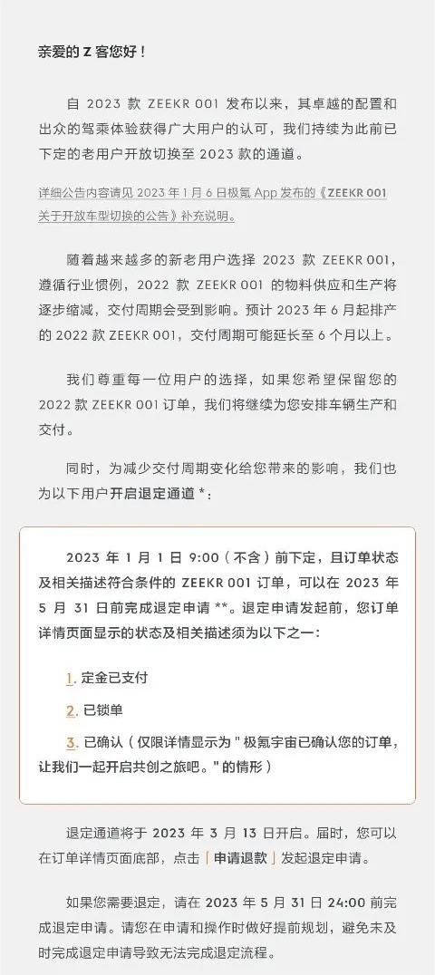 3月9日,极氪宣布,受2022款极氪001预计交付延长的影响,2023年1月1日9:00前(不含)下定,且尚未排产的极氪001订单,可以申请退定了。