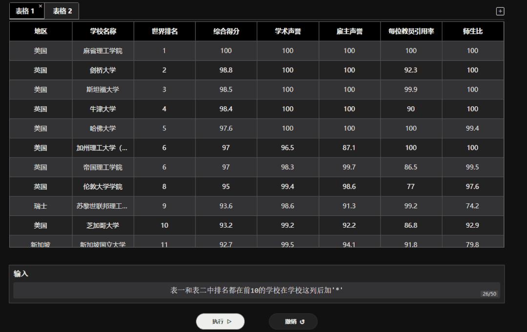 甚至 ChatExcel 还能帮你处理多张不同表格中的数据,你上传了两张世界各个大学的排名,想要给排名第 10 的学校标记一下,也没问题~