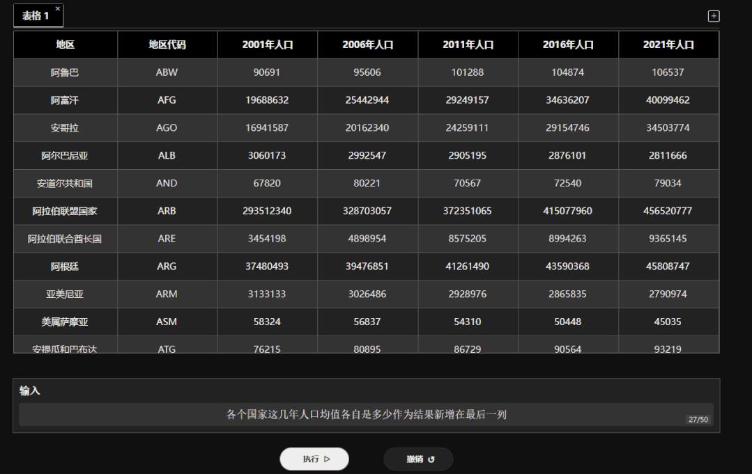 接下来我们加大难度,比如想知道各个国家这几年人口均值各自是多少,我们只需要把这个需求跟 ChatExcel 提出就可以,不用全网搜索 Excel 函数了。