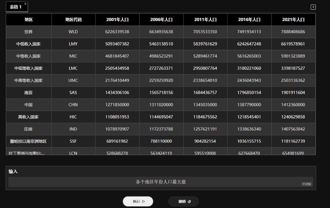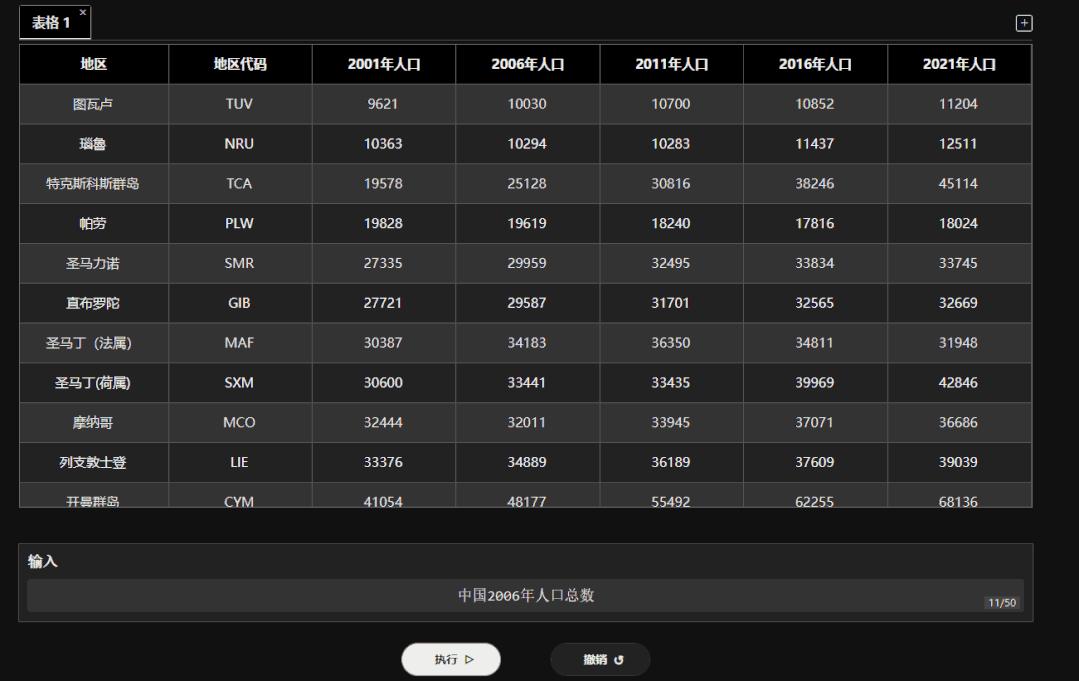 比如说差评君上传了 2001 年 ~ 2021 年全球人口总数的表格,想要知道在 2006 年中国的人口总数,直接输入命令就可以了。