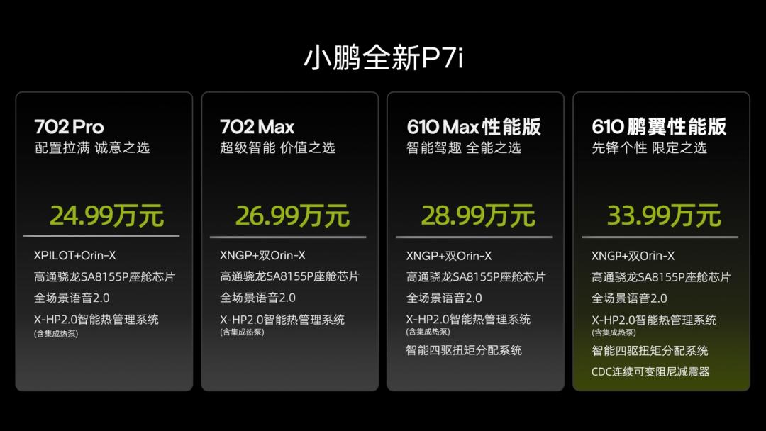 除此之外,小鹏变化最大的营销策略,明显吸取了之前的教训。与老款车型相比,小鹏 P7i 的 SKU 明显简化。小鹏 P7i 延续了 G9 的策略,SKU 大大简化,2 套驱动形式、2 个 ADAS 方案、3 种电池容量,最终只保留 4 个款型,分别是 702Pro、702Max、610Max 性能版以及 610 鹏翼性能版。