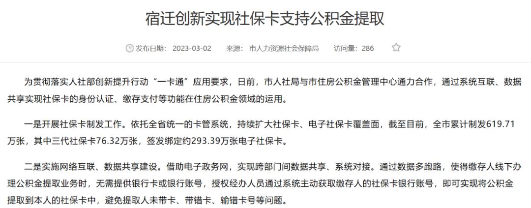 3月2日,据江苏宿迁市人力资源社会保障局消息,该局与宿迁市住房公积金管理中心通力合作,通过系统互联、数据共享实现社保卡的身份认证、缴存支付等功能在住房公积金领域的运用。
