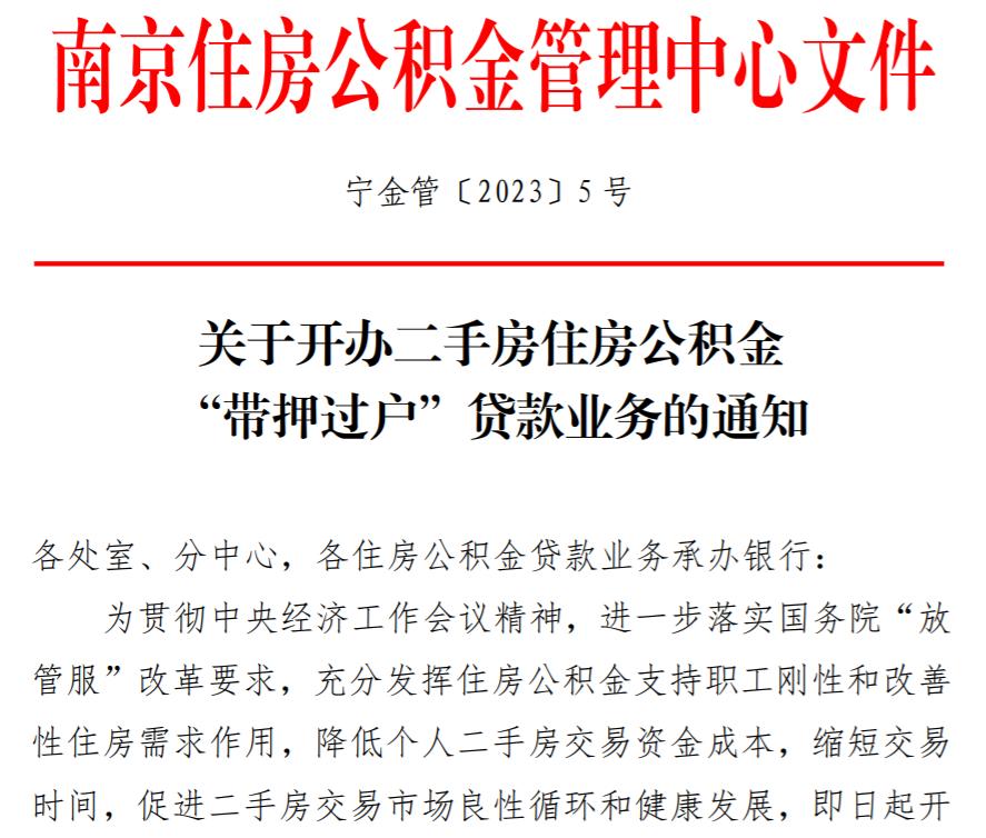 3月1日,南京住房公积金管理中心官网发布《关于开办二手房住房公积金“带押过户”贷款业务的通知》指出,在二手房交易过程中,经买卖双方协商一致,无须卖方先结清贷款并解除抵押,即可通过公积金“带押过户”贷款业务,办理房屋过户和抵押登记,从而使买方具备住房公积金贷款放款前须落实所购住房抵押担保的条件。在经过审批后,进而获得公积金贷款放款。