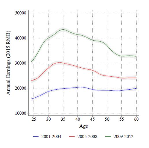 中国人收入与年龄的关系,绿线是2009-2012的情况,最高点在35岁