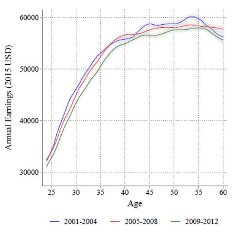 美国人收入与年龄的关系,绿线是2009-2012的情况,最高点在55岁