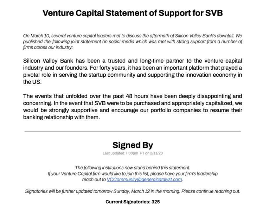 创业孵化器Y Combinator也牵头发布了一份由数百名创业者共同签署的请愿书,呼吁美国财政部长珍妮特·耶伦和其他监管机构介入处理SVB破产事件,要求“缓解和关注对小企业、创业公司及在SVB有存款的公司员工的直接重大影响”,并恳请国会“恢复对区域银行更有力的监管和资本要求”。