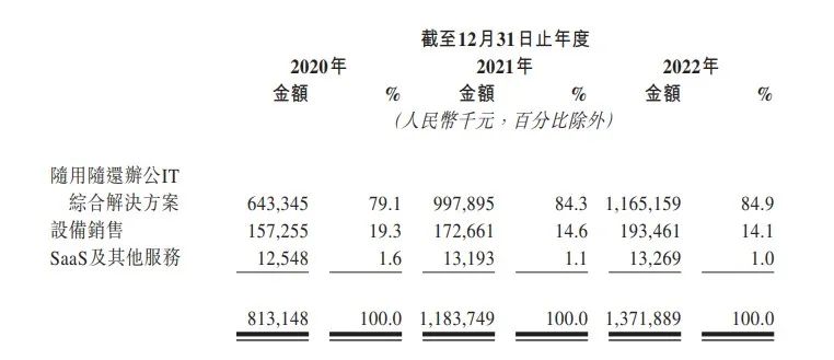 据招股书,易点云营收来源于随用随还办公IT租赁综合解决方案、设备销售、SaaS及其他服务。其中,主要收入来源为随用随还办公IT租赁综合解决方案业务,即IT办公设备租赁服务。2020年、2021年及2022年,易点云来自随用随还办公IT综合解决方案的收入分别为6.43亿元、9.98亿元、11.65亿元,占总营收的比重分别为79.1%、84.3%、84.9%。