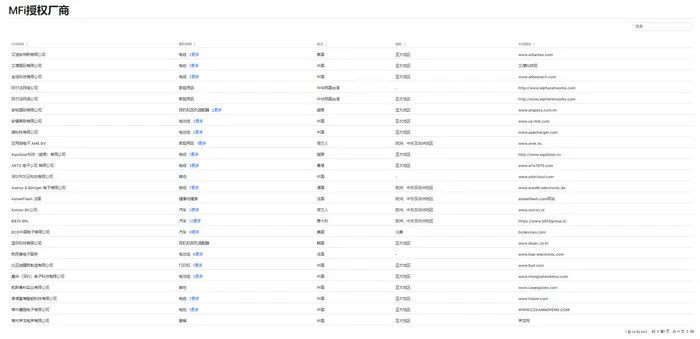不难理解,MFi认证的这块“蛋糕”,苹果不打算丢下,也不会丢下。查询了解,除苹果原装数据线外,业内一直存在巨大体量的第三方市场,苹果官网也提供了通过MFi授权的厂商列表(https://mfi.apple.com/account/authorized-manufacturers)。足足17页、累计403个品牌的列表中,中国厂商占据了大半。据不完全统计,截至2017年4月,苹果的全球授权厂商数量在900家左右,其中来自中国(包括港澳台地区)的厂商约700余家。