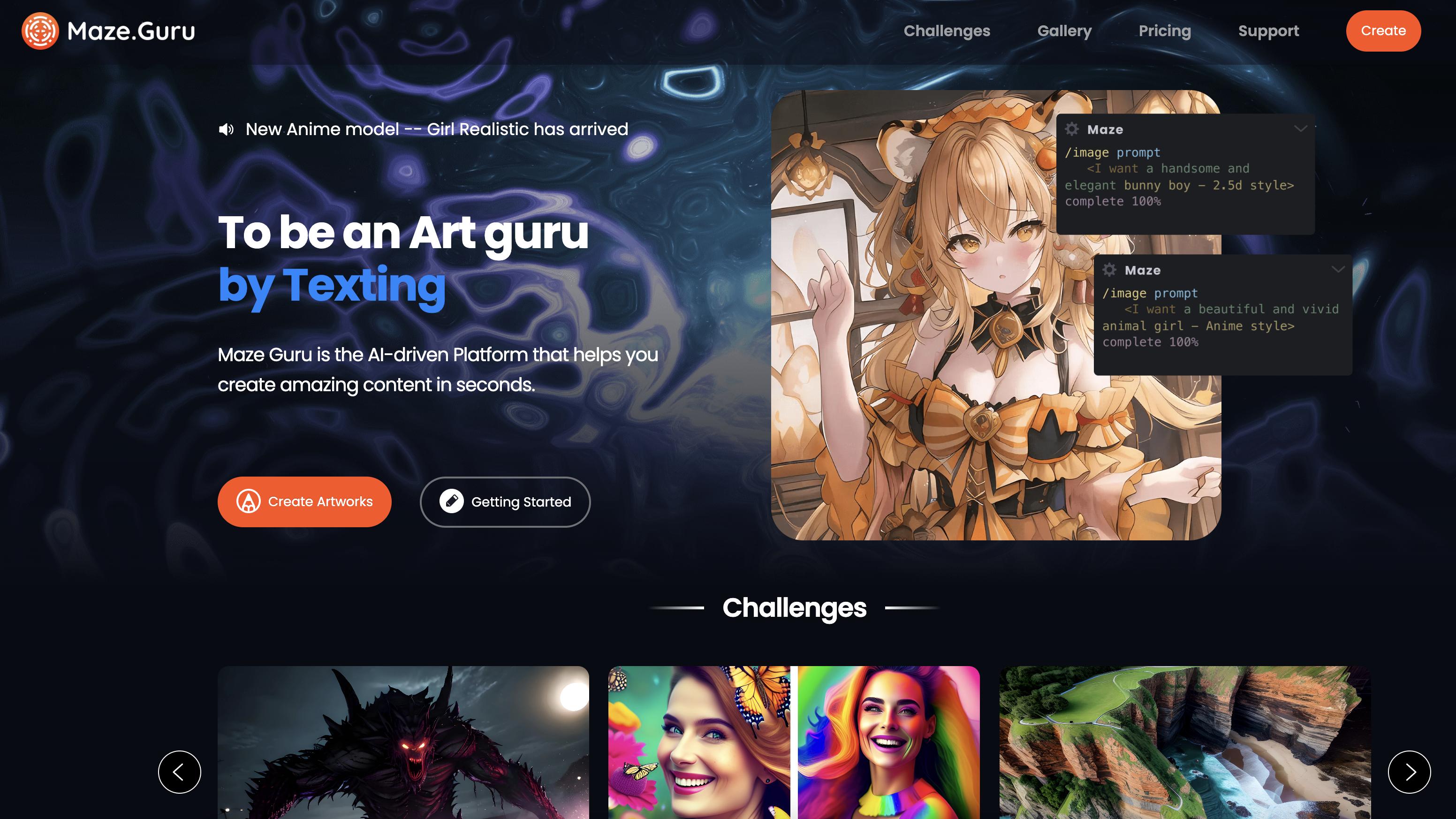 Maze Guru 是一个由 AI 驱动的 AI 绘画生成平台,可帮助您在几秒钟内根据你提供的 Prompt 构建内容。Maze Guru 拥有一个“画廊(Gallery)”,展示了来自社区生成的最佳 AI 绘画作品,同时对这些作品按照生成模型进行了分类。用户可以查看自己喜欢的作品及其 prompt,然后在平台上使用三种模型(Anime、Stable、Disco)以及多达数十种绘画风格(油画风、SD2.0、机甲等等)进行更多创作。
