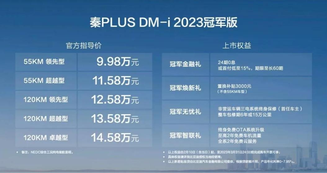 秦PLUS DM-i 2023冠军版打响了比亚迪实现2023年销量目标的第一枪。有业内人士谈到:2023年,比亚迪还将推出微型车海鸥、高端车仰望、王朝系列改款车型以及全新F品牌等新品,350万辆乃至400万辆的销量目标或并非遥不可及。