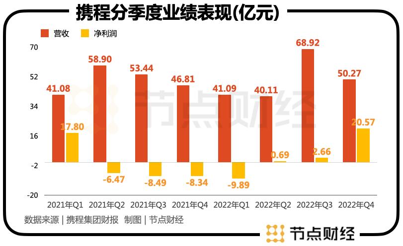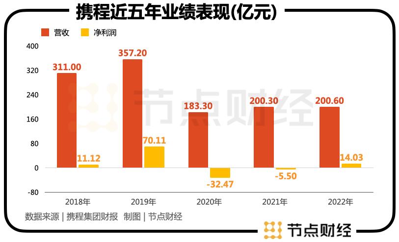 以行业“执牛耳者”的携程为例。财报显示,2022年,其实现营业收入200.6亿元,同比增长0.13%;实现净利润14.03亿元,同比2021年的-5.5亿元扭亏为盈。