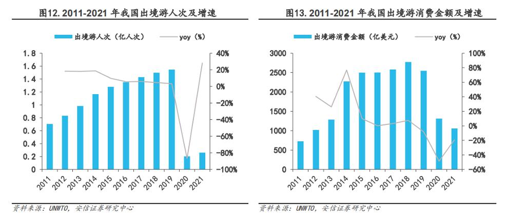 根据联合国世界旅游组织(WTO)的数据,2019年中国游客在海外消费2546亿美元,占全球旅游支出的近五分之一。2009-2019年间,中国出境旅游人数平均每年增长12.8%,而全球平均水平为5.1%;按照《2023年全球旅游业晴雨表》预测,2023年全球国际游客抵达人数可能恢复到疫情前水平的80%-95%。