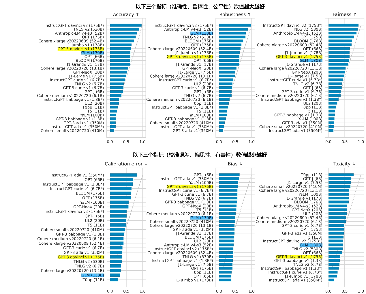 同时,智谱AI还开启了ChatGLM线上模型的内测。相比起ChatGLM-6B,ChatGLM线上模型的能力提升主要来源于独特的千亿基座模型GLM-130B。它采用了不同于BERT、GPT-3以及T5的GLM架构,是一个包含多目标函数的自回归预训练模型。2022年11月,斯坦福大学大模型中心对全球30个主流大模型进行了全方位的评测,GLM-130B是亚洲唯一入选的大模型。在与OpenAI、Google Brain、微软、英伟达、Meta AI的各大模型对比中,评测报告显示GLM-130B在准确性和公平性指标上与GPT-3 175B (davinci) 接近或持平,鲁棒性、校准误差和无偏性优于GPT-3 175B(下图)。