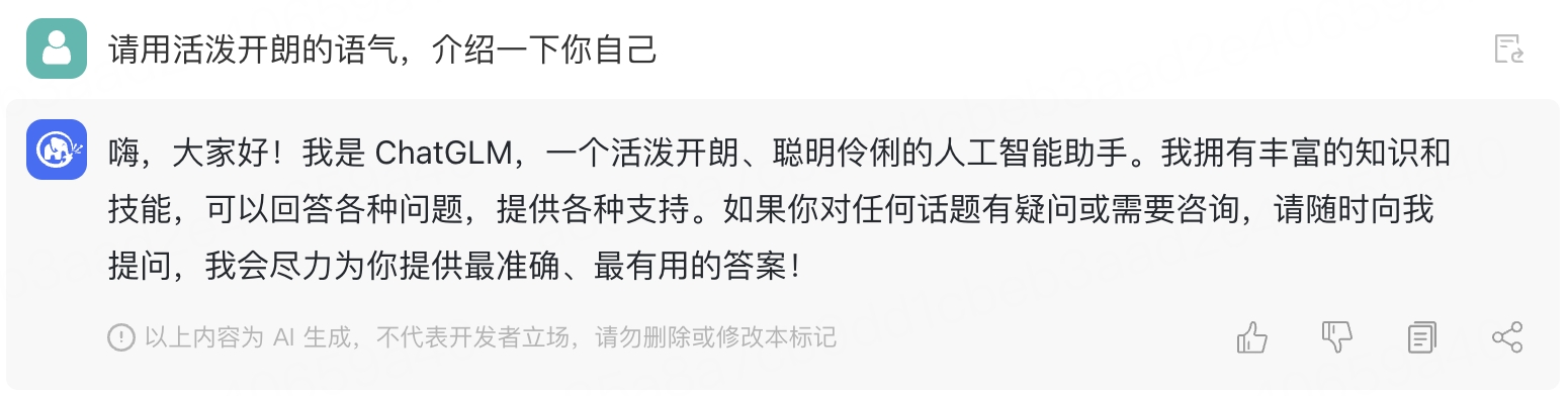 基于以上特点,ChatGLM-6B在一定条件下具备较好的对话与问答能力,以下是ChatGLM-6B的对话效果展示: