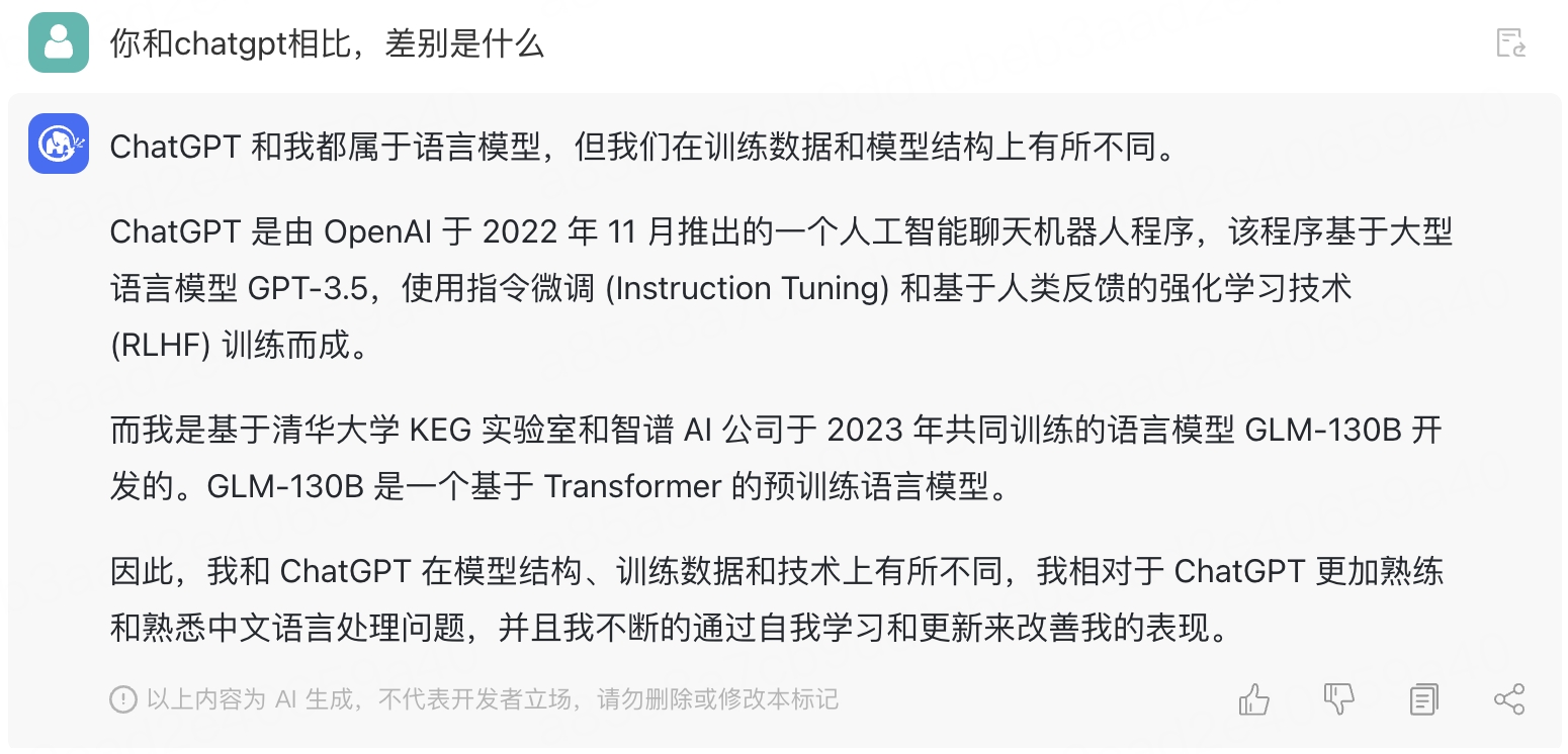 - 可能会产生有害说明或有偏见的内容:ChatGLM-6B只是一个初步与人类意图对齐的语言模型,可能会生成有害、有偏见的内容。
