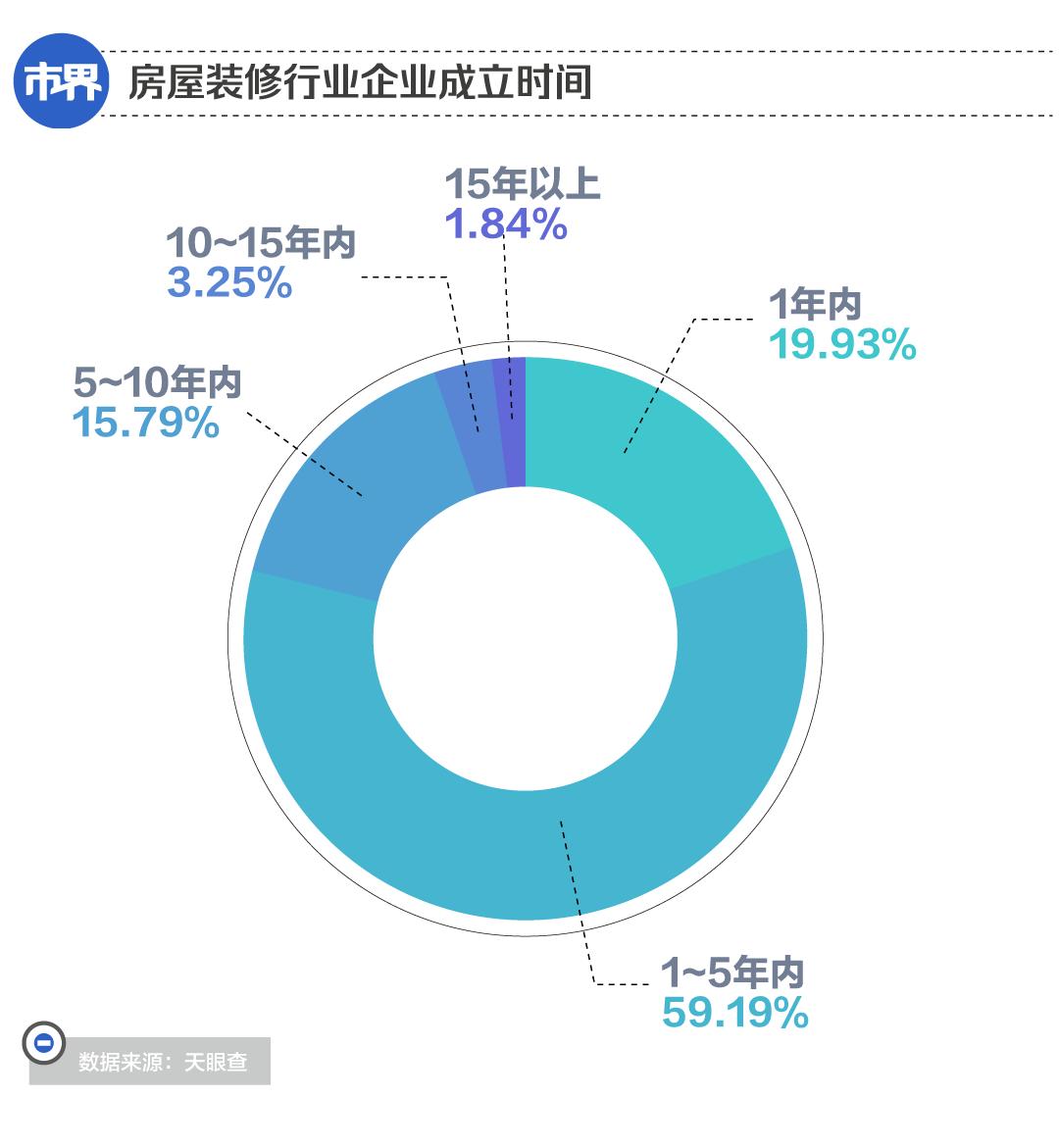 据天眼查数据显示,2020年开始,近三年每年都有超过80万家装修类企业注册,行业内有将近80%的装修公司成立时间不足五年,其中19.93%成立时间在一年内,59.19%的公司成立时间在1-5年,成立时间在15年以上的公司仅占1.84%。这也就意味着,装修行业98%以上的公司活不过15年。