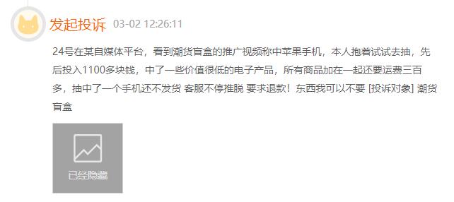 “在某自媒体平台,看到潮货盲盒的推广视频称中苹果手机,抱着试试的想法去抽,先后投入1100多块钱,中了一些价值很低的电子产品,所有商品加在一起还要运费三百多,抽中了一个手机还不发货,客服不停推脱。”