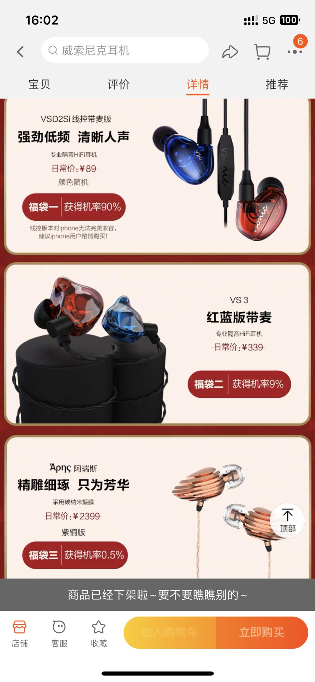 包括日常价89元的VSD2Si,获得几率90%;日常价339元的VS3,获得几率9%;另有两款日常价2399元的高档耳机,获得几率都是0.5%。
