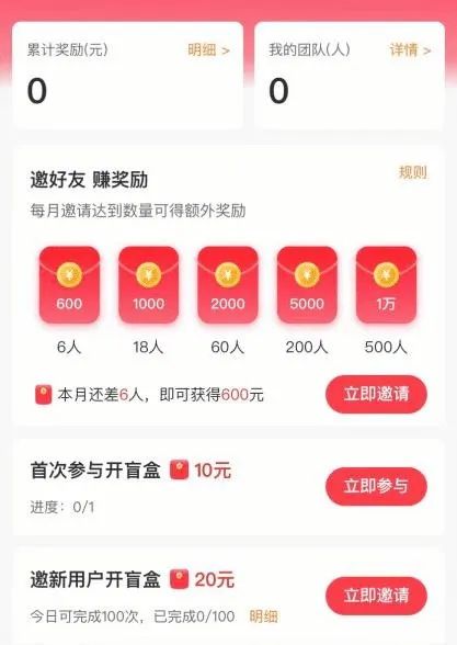 此外,每邀请一名新用户参与盲盒活动可获得20元奖励,每月邀请用户达到指定数量还可获得额外现金奖励,邀请500人额外奖励1万元。