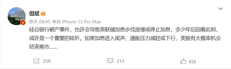 而知名私募大佬、深圳东方港湾投资管理股份有限公司董事长但斌也于3月13日在社交媒体发文:硅谷银行破产事件,也许会导致美联储加息步伐放缓或停止加息,多少年后回看此刻,或许是一个重要的转折。
