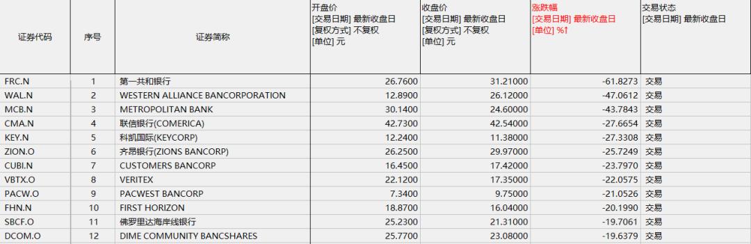 具体来看,第一共和银行跌61.83%,甚至盘中一度停牌,创其上市以来最大单日跌幅;阿莱恩斯西部银行(WESTERN ALLIANCE BANCOROORATION)、大都会银行(METROPOLITAN BANK)均跌超40%,其中阿莱恩斯西部银行跌47.06%;另外,联信银行、科凯银行、齐昂银行等7家银行跌幅均超20%。