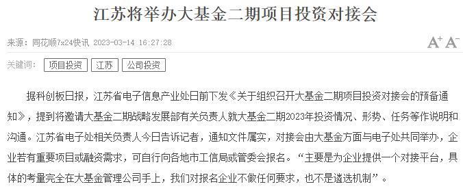 今天,又传出了进一步的消息。有媒体报道,江苏省电子信息产业处日前下发《关于组织召开大基金二期项目投资对接会的预备通知》,提到将邀请大基金二期战略发展部有关负责人就大基金二期2023年投资情况、形势、任务等作说明和沟通。这则报道已经得到江苏省电子处相关负责人的确认,对接会由大基金方面与电子处共同举办,企业若有重要项目或融资需求,可自行向各地市工信局或管委会报名。