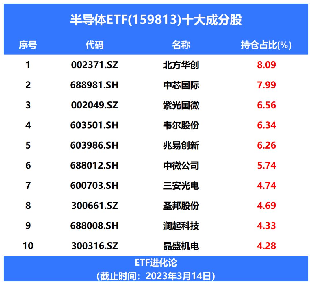 在A股好的半导体ETF并不少。比如今日上涨2.85%的半导体ETF(159813)。这个ETF最新规模31.1亿,跟踪的是国证半导体芯片指数,成分股来自沪深市场30只芯片半导体上市公司,行业集中度高,前十大权重股涵盖北方华创、中芯国际、紫光国微、韦尔股份、兆易创新等龙头企业,把整个产业的核心龙头一起买了。