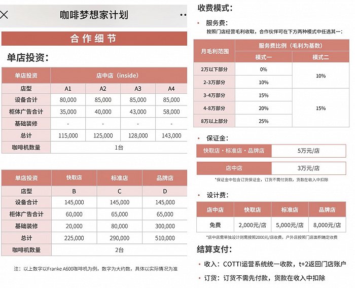 和瑞幸咖啡大肆开放加盟渠道一样,库迪咖啡的门店激增也有赖于今年以来它大力推广的加盟模式“咖啡梦想家计划”。在库迪咖啡微信公众号中,可以看到该计划的项目亮点、产品介绍、合作细节等内容。其中,店中店、快取店、标准店、品牌店四种店型的开店成本在11.5万元-51万元不等,算上房租、人力成本会更高。