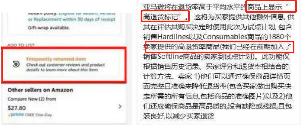 前一阵子,有消息透露,亚马逊将会给退货率高的产品贴上“高退货率”标签——“Frequently Returned Items”(经常被退货的产品)。届时,退货较多的产品,将会在listing页面上显示。