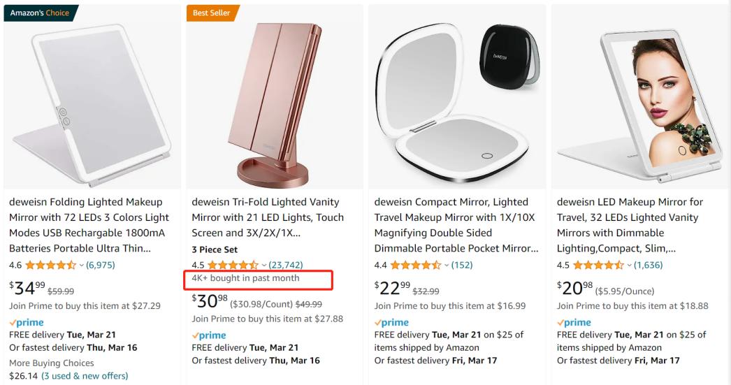 如下图,一款Bestseller的镜子显示,上个月销量为4000+(4k+ bought in past month)。这一信息,不仅在电脑桌面端有显示,同时也在手机等移动端显示。