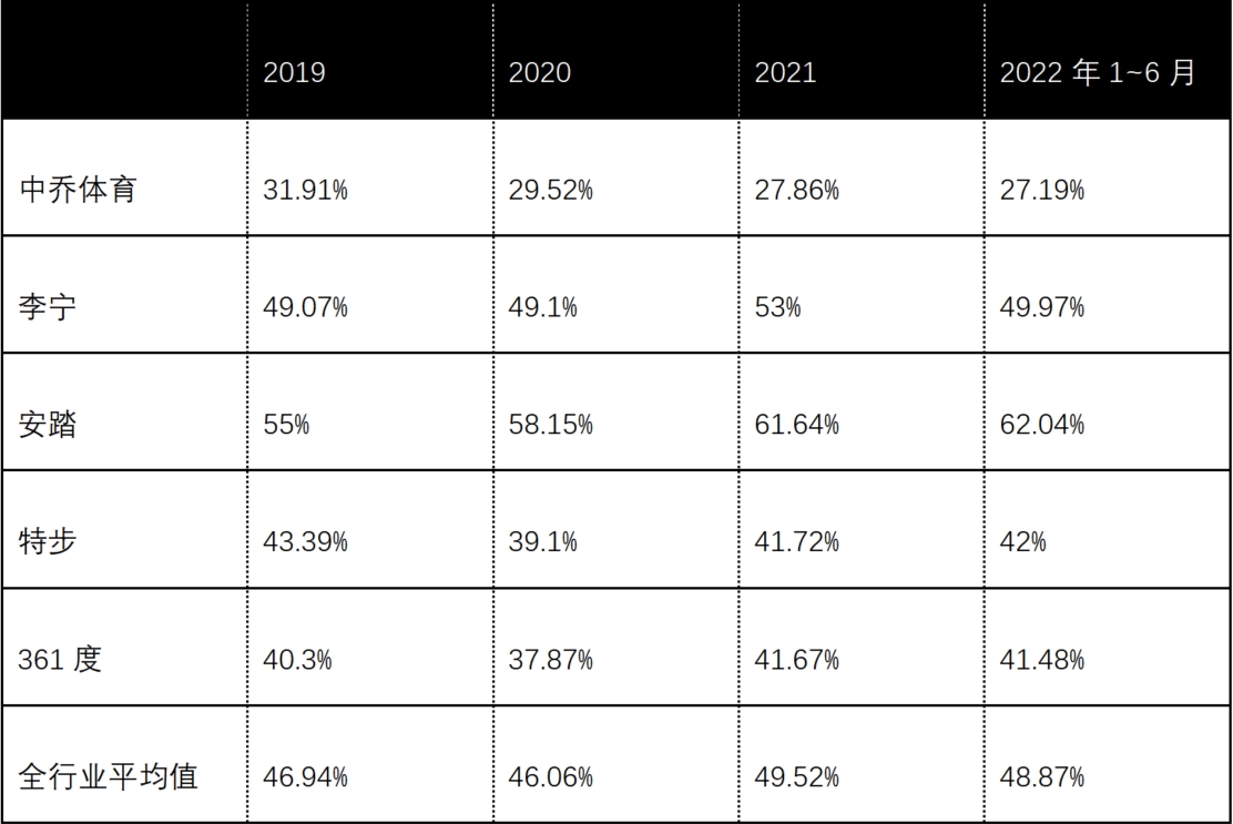 2019年到2022年上半年,中乔体育的综合毛利率分别为31.91%、29.52%、27.86%、27.19%,同样大幅低于行业平均水平。