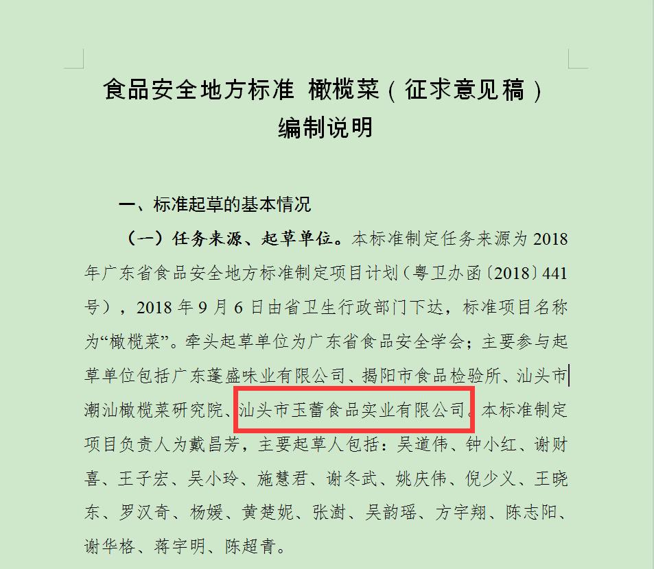 然而,小编注意到, 该标准的牵头起草单位为广东省食品安全学会,主要起草单位,汕头市玉蕾食品实业有限公司也在列。