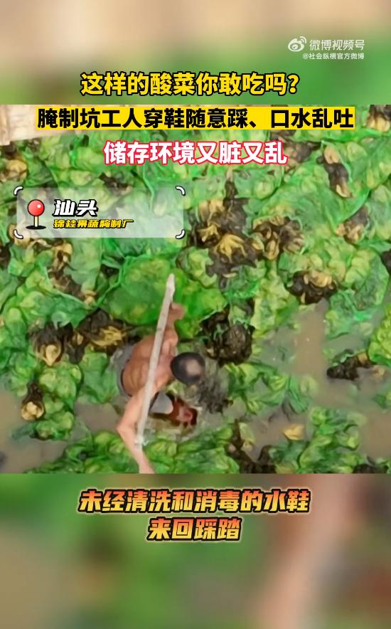 据广东电视台《社会纵横》栏目,3月14日消息,汕头腌制菜厂腌制过程出现:工人穿鞋随意踩、乱吐白色不明物体、储存环境又脏又乱等乱象。