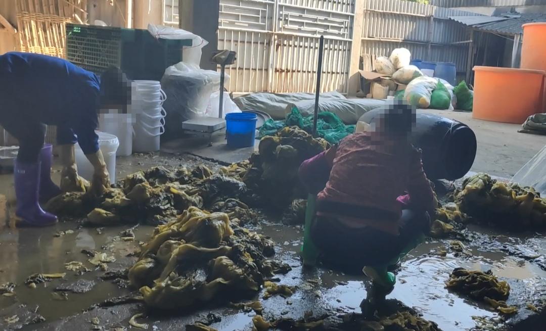 工人赤脚踩原料、乱吐白色异物...