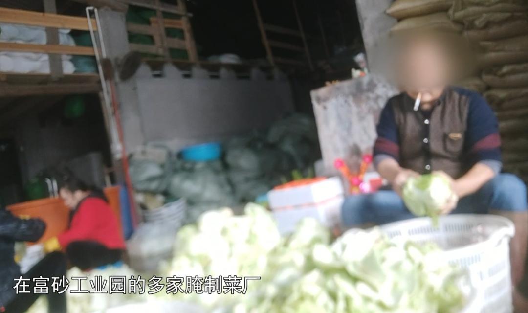 第二,生产流程混乱无序。 在富砂工业园多家腌制菜厂,工人们一边抽烟,一边处理酸咸菜。