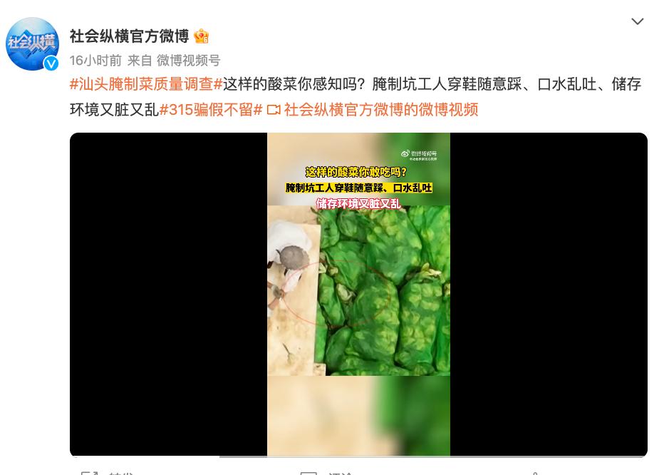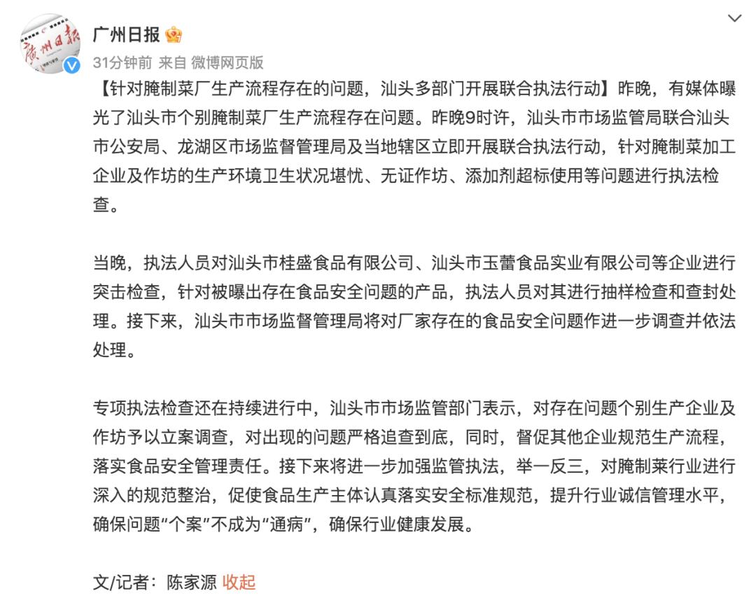 14日晚9时许,汕头市市场监管局及汕头市龙湖区市场监督管理局连夜赶赴涉事企业进行现场执法。3月15日早间,#汕头再现工人赤脚踩腌菜#、#汕头市监局连夜查封多家腌制菜生产商#、#橄榄菜#等话题一度冲上热搜。